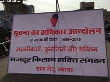 The Mazdoor Kisan Shakti Sangathan (Association for the Empowerment of Workers and Peasants) is an Indian social movement and grassroots organisation best known for its successful struggle and demand for the Right to Information Act (RTI) which grew out of the demand for minimum wages for workers.[1] It is one of the forefront civil rights movements in India, and can cite legislation of the RTI as its major achievement.