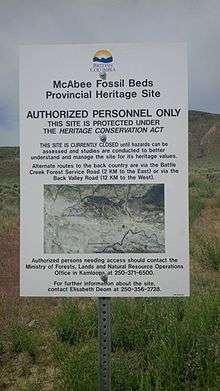 - ↑ McAbee Fossil Beds Heritage Site. Canadian Register of Historic Places. Retrieved 24 October 2014.