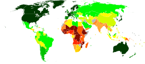 Some economists, such as Guy Pfeffermann, say that other non-monetary indicators of "absolute poverty" are also improving. Life expectancy has greatly increased in the developing world since World War II and is starting to close the gap to the developed world where the improvement has been smaller. Even in Sub-Saharan Africa, the least developed region, life expectancy increased from 30 years before World War II to a peak of about 50 years — before the HIV pandemic and other diseases started to force it down to the current level of 47 years. Child mortality has decreased in every developing region of the world.[10] The proportion of the world's population living in countries where per-capita food supplies are less than 2,200 calories (9,200 kilojoules) per day decreased from 56% in the mid-1960s to below 10% by the 1990s. Between 1950 and 1999, global literacy increased from 52% to 81% of the world. Women made up much of the gap: Female literacy as a percentage of male literacy has increased from 59% in 1970 to 80% in 2000. The percentage of children not in the labor force has also risen to over 90% in 2000 from 76% in 1960. There are similar trends for electric power, cars, radios, and telephones per capita, as well as the proportion of the population with access to clean water.[11]