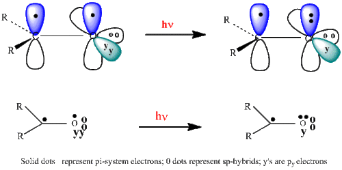 Starting in 1961 it was found that one could understand organic photochemical reactions in the context of the relevant excited states.[8][9][10] One example is the n-pi* excitation of mono-carbonyl compounds, the simplest being that of formaldehyde. The structure was first described by Mulliken.[11] The three-dimensional representation (top drawing) is simplified in the second line using a two-dimensional representation, which facilitates arrow pushing.[9][10]