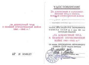 | Medal "For Valiant Labour in the Great Patriotic War 1941–1945" | |