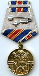 The Medal "In Commemoration of the 250th Anniversary of Leningrad" (Russian: Медаль «В память 250-летия Ленинграда») was a state commemorative medal of the Soviet Union established by decree of the Presidium of the Supreme Soviet of the USSR on May 16, 1957[1] to commemorate the 250th anniversary of the city of Leningrad. It was awarded to prominent members of Soviet society including veterans of the Great Patriotic War and serving members of the armed forces for wartime and peacetime services to the Hero-City of Leningrad.