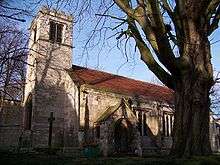 The present St Lawrence building is Victorian, but in its churchyard is the small tower of its predecessor (in which Sir John Vanbrugh was married in 1719). This dates back to the twelfth century, although its top storey was added in the fifteenth century. The tower, which is in the care of the Churches Conservation Trust, has an impressive Norman doorway, formerly one of the entrances to the nave. The old nave and chancel is marked out in medieval and 18th-19th Century gravestones, including those of the Heskeths and Yarburghs of Heslington Hall. The medieval font, along with four early-Victorian windows and some earlier furnishings, can still be seen in the 'new' church.[4]