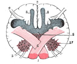 About 90% of these fibers leave the pyramids in successive bundles and decussate (cross over) in the anterior median fissure of the medulla oblongata as the pyramidal decussation or motor decussation. Having crossed over at the middle line, they pass down in the posterior part of the lateral funiculus as the lateral corticospinal tract. The other 10% of the fibers stay uncrossed in the anterior corticospinal tract. The pyramidal decussation marks the border between the spinal cord and the medulla oblongata.[1]