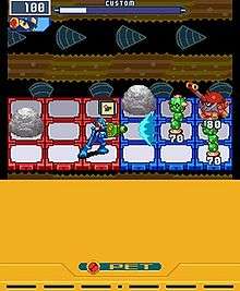 When Mega Man encounters viruses, the screen shifts to a battle screen, set on a six by three square grid. On the left half of the grid is Mega Man, and on the other half are his opponents. Mega Man has a relatively weak arm cannon, the MegaBuster, but his main weapon is Lan's library of battle chips, one-use-per-battle special attacks which grant various abilities, including simple attacks, attack enhancements, defensive effects, terrain transmogrification, or assistance from other Navis. Before battle, the player can construct a folder consisted of thirty battle chips, and each turn of a battle (measured by a timer bar at the top of the screen), the player is presented with a random selection of these chips. The player can send Mega Man up to five battle chips, after which the battle takes place in real time, with MegaMan, controlled by the player, attacking with his MegaBuster, dodging attacks, or activating battle chips from his queue.[2][3]