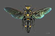 - ↑ Sarrazin, Michael; Vigneron, Jean Pol; Welch, Victoria; Rassart, Marie (5 November 2008). "Nanomorphology of the blue iridescent wings of a giant tropical wasp Megascolia procer javanensis (Hymenoptera)". Phys. Rev. E 78 (5). doi:10.1103/PhysRevE.78.051902. Measurement scale on Figure 1.