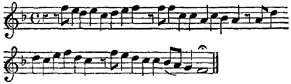 The tonus peregrinus variant that is associated with Luther's German Magnificat appears in compositions by, among others, Johann Schein, Heinrich Schütz, Johann Pachelbel and Dietrich Buxtehude. Bach uses the melodic formula as an instrumental cantus firmus in movement 10 (Suscepit Israel) of his Latin Magnificat.[11] He uses it again in his "German Magnificat", i.e. the cantata Meine Seel erhebt den Herren BWV 10 composed for Visitation of 1724, in the chorale harmonisations BWV 323 and 324, and in the fourth Schübler Chorale BWV 648.[12][13] Also in BWV 733, Fuga sopra il Magnificat, the melodic formula is used as a theme: this chorale prelude may however be the work of Bach pupil Johann Ludwig Krebs.[14][15]
