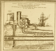 Construction of the river tunnel started from two 180 feet (55 m) deep shafts, one on each bank, containing water pumps. Three tunnels were to be dug, one for the two tracks, a drainage tunnel and a ventilation tunnel. A 7 feet 2 inches (2.18 m) diameter ventilation tunnel was dug as the pilot heading. Some 38 million bricks were used for the construction of the main tunnel.[5] When the tunnel was opened, fans on both banks changed the air in the tunnel every seven minutes.[6]