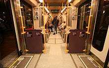 With the partial opening of Westside MAX in 1997, TriMet's "Type 2" light rail vehicle were introduced. The Siemens model SD660 (originally SD600, but retroactively redesignated SD660 in 1998[49]) have a low-floor design, a first for light rail vehicles in North America,[50][51] digital readerboards and a slightly more open floor plan. The floor is nearly level with the platforms, and small ramps called "bridge plates" extend (on request) from two of the four doors, enabling passengers in wheelchairs to roll on and off of the vehicle easily. These permitted the elimination of wheelchair lifts that had been located at every station and were time-consuming to use.[52] High-floor Type 1 cars are now always paired with a low-floor Type 2 or 3 car so that each train is wheelchair-accessible.