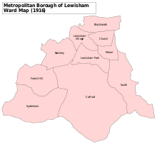 The borough was divided into ten wards for elections: Blackheath, Brockley, Catford, Church, Forest Hill, Lewisham Park, Lewisham Village, Manor, South and Sydenham.[7][8]