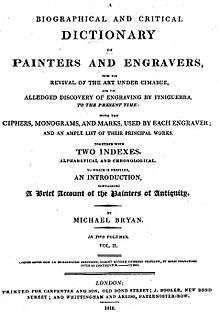 In 1804 Bryan retired from the art world, and settled at his brother's home in Yorkshire, where he remained until 1811. In 1812 Bryan again visited London, and commenced writing his "magnum opus" - the "Biographical and Critical Dictionary of Painters and Engravers" in 2 volumes. The first part appeared in May 1813, and concluded in 1816. He owned a gallery in London's Savile Row, which became a fashionable gathering place for artists and their patrons.[5] In 1818 he became involved with some speculative art purchases which proved a failure.[4]