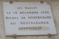Municipal plaque on the claimed birthplace of Nostradamus in St-Rémy, France, describing him as an 'astrologer' and giving his birth-date as 14 December 1503 (Julian Calendar)