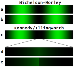 Using a special optical arrangement involving a 1/20 wave step in one mirror, Roy J. Kennedy (1926) and K.K. Illingworth (1927) (Fig. 8) converted the task of detecting fringe shifts from the relatively insensitive one of estimating their lateral displacements to the considerably more sensitive task of adjusting the light intensity on both sides of a sharp boundary for equal luminance.[14][15] If they observed unequal illumination on either side of the step, such as in Fig. 8e, they would add or remove calibrated weights from the interferometer until both sides of the step were once again evenly illuminated, as in Fig. 8d. The number of weights added or removed provided a measure of the fringe shift. Different observers could detect changes as little as 1/300 to 1/1500 of a fringe. Kennedy also carried out an experiment at Mount Wilson, finding only about 1/10 the drift measured by Miller and no seasonal effects.[A 32]