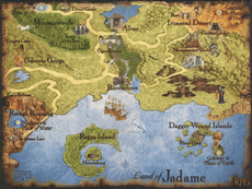 The continent of Jadame is first introduced in this game, previously unmentioned in the series. The four elemental gateways appear in the four corners of Jadame: the Gateway of Earth on one of the Dagger Wound Islands (southeast), the Gateway of Water in Ravage Roaming (southwest), the Gateway of Air in the Murmurwoods (northwest), and the Gateway of Fire in the Ironsand Desert (northeast). In each case they cause an environmental disaster: a volcano in the Dagger Wound Island chain erupts and the tremors destroy the bridges that link the islands, the minotaur undercity in Ravage Roaming is flooded, the trees in a large area of the Murmurwoods are uprooted by the winds, and much of the troll settlement in Ironsand is destroyed by an explosion of fire. Escaton raised an enormous crystal in the centre of the city of Ravenshore, which acts as the portal to the Plane Between Planes, where the Destroyer resides.