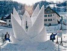 From 1996 he has constructed monumental sculpture for locations in the Americas, Europe and Asia.[4] These include a sculpture in Sokogla, Thailand (2005), works for the 2008 Olympics in Beijing, a work to commemorate the 80th birthday and 60th anniversary of the reign of King Bhumibol Adulydesen of Thailand (2006), a stainless steel piece in France (2007), a black marble sculpture for the ITM University, Gwalior in Bhopal, India (2007), a stainless steel piece called Amantes for the city of Goyan, South Korea (2009) and monumental sculpture for his hometown (2009) .[4] In 2008, he created a sculpture called La Tehuana, which is located at the main highway entrance to the city of Tehuantepec, Oaxaca. The theme of the piece is traditional, an image of a traditional Tehuana bride, which has been adopted as the symbol of an area where women play a dominant social role.[2][6] However, it is a modern interpretation done in stainless steel, a style more common in the center and north of Mexico than in the south.[7]}
