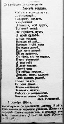 Mikhail Isakovsky was born in village Glotovka, Yelnya Uyezd, Smolensk Governorate, in a poor peasant family of Russian ethnicity.[1] A local priest taught him to read and write. Later he had been studying at a gymnasium for 2 years. His first poem Просьба солдата was published in 1914 in an All-Russia newspaper Nov (Новь). In 1918 he joined the Communist Party of the Soviet Union. From 1921 until 1931 he had been working in Smolensk newspapers.