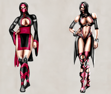 Like Kitana and Jade, Mileena was originally portrayed by Katalin Zamiar in Mortal Kombat II, who was using her own sai.[47] A false rumor printed in Game Informer told of a Mileena-like secret character named Emerald supposedly hidden in the game.[48] After MKII, Mileena was officially declared by Tobias and Boon to be "gone" and not returning,[49] yet was brought back due to popular demand, with Becky Gable taking over the role in Ultimate Mortal Kombat 3. Mileena's main color has been either a shade of purple or magenta in various installments (including when masquerading as Kitana in Deception) and their outfits did not differ in a significant way (more than just having different color patterns) until Mortal Kombat Gold. Since then, her costumes have been generally getting more skimpy with every new game,[34] including always having an exposed midriff since Deception. Mileena's main costume in Deception and Armageddon is actually mostly black and features long flowing arm sleeves, a back-only loincloth and a partially transparent veil. Her motion capture actor in these games was Carlos Pesina.[7] In Shaolin Monks, Mileena appears half-naked (her costume made largely of just belts of leather and scraps of fabric), barefoot (with a bandaged midfoot), and again wearing a veil in place of a mask (the veil also returns as part of her formal outfit in Mortal Kombat 2011). In the 2011 reboot game, her prime costume is based on her famous provocative alternate from Deception, but more detailed and again featuring a mask. In all, in this game she has the largest number of costumes out of all characters in the entire series. Her "Flesh Pit" alternate costume in the 2011 game is made of just some loose bandages put around her otherwise completely naked body,[50][note 7] marking the first time that she has appeared unmasked by default. In this game, her motion capture actress was a woman.[53] "The Ultimate Horror Pack" DLC for Mortal Kombat X included the Vampiress Mileena.[54]