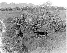 Some dogs are trained to silently locate booby traps and concealed enemies such as snipers. The dog's keen senses of smell and hearing would make them far more effective at detecting these dangers than humans. The best scout dogs are described as having a disposition intermediate to docile tracking dogs and aggressive attack dogs.[37] Scouting dogs are able to identify the opposing threat with in 1,000 yards of area. This method of scouting is more efficient compared to human senses. [38] Scout dogs were used in World War II, Korea, and Vietnam by the United States to detect ambushes, weapon caches, or enemy fighters hiding underwater, with only reed breathing straws showing above the waterline. The US operated a number of scout dog platoons (assigned on a handler-and-dog team basis to individual patrols) and had a dedicated dog training school in Fort Benning, Georgia.[37]
