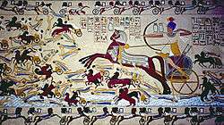 Chariotry, the backbone of the Egyptian army, was introduced into ancient Egypt from Western Asia at the end of the Second Intermediate Period (c.1650-1550 BC) / the beginning of the New Kingdom (c.1550-1069 BC).[25] Charioteers were drawn from the upper classes in Egypt. Chariots were generally used as a mobile platform from which to use projectile weapons, and were generally pulled by two horses[26] and manned by two charioteers; a driver who carried a shield, and a man with a bow or javelin. Chariots also had infantry support.[27] By the time of Qadesh, the chariot arm was at the height of its development. It was designed for speed and maeuverability, being lightweight and delicate in appearance. Its offensive power was in its capacity to rapidly turn, wheel and repeatedly charge, penetrating the enemy line and functioning as a mobile firing platform that afforded the fighting crewmen the opportunity to shoot many arrows from the composite bow. The chariot corps served as an independent arm but were attached to the infantry corps. At Qadesh, there were 25 vehicles per company. Many of the lighter vehicles were retained for scouting and communication duties. In combat, the chariots were deployed in troops of 10, squadrons of 50 and the larger unit was called the pedjet, commanded by an officer with the title 'Commander of a chariotry host' and numbering about 250 chariots.[28]