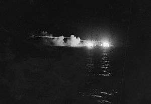 The Leander helped sink the Japanese cruiser Jintsu in the Battle of Kolombangara on the night of 11–12 July 1943. Holed by a Japanese torpedo during the engagement, the Leander withdrew to Auckland for repairs.