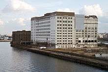 The Royal Docks closed in 1981,[14] and many businesses relocated to Tilbury.[4] The London Docklands Development Corporation (LDDC) was in discussion in the 1990s with the Zoological Society of London for a public aquarium on the site of the former CWS mill, but funding for it was difficult to find and the idea was eventually shelved.[4] The Rank and CWS mills were demolished by the LDDC in the 1990s, along with the Millennium Mills' B and C silos. The D silo to the south is Grade II listed.[15] Millennium Mills itself is locally listed by Newham Council.[16]
