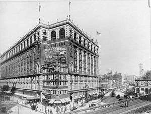 The five-story building on that corner had been purchased by Robert H. Smith in 1900 for $375,000—an enormous sum at the time, equivalent to $10.7 million in 2016. The idea had been to obstruct Macy's from becoming the largest store in the world. It is largely supposed that Smith, who was a neighbor of the Macy's store on 14th Street, was acting on behalf of Siegel-Cooper, which had built what they thought was the world's largest store on Sixth Avenue in 1896. Macy's ignored the tactic and built around the building, which now carries Macy's "shopping bag" sign (proclaiming Macy's the "world's largest store") by lease arrangement.[2]
