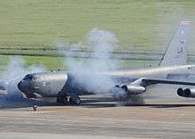 On the morning of December 16, 1982, A B-52G Stratofortress of the 328th Bombardment Squadron, 93rd Bombardment Wing, at Castle Air Force Base crashed while attempting a MITO, killing all 9 crewmembers on board. It had just taken off from Mather Air Force Base when they encountered trouble. The aircraft, which was carrying 290,000 pounds of fuel, crashed about a mile and a half from Mather and blew up in a ball of fire around 250 feet in diameter. The resulting crash left a 400-yard path of burning debris, killed three horses, and left four people needing treatment for smoke inhalation.[6] The cause was determined to have been the result of the jet trying to avoid the jetwash of the lead plane, showing the inherent risk behind launching aircraft so close together.