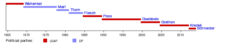 | Antoine Wehenkel | LSAP | 15 July 1964 | 6 February 1969 | Pierre Werner | |