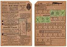 The current system of National Insurance has its roots in the National Insurance Act 1911, which introduced the concept of benefits based on contributions paid by employed persons and their employer.[4] The chosen means of recording the contributions required the employer to buy special stamps from a Post Office and affix them to contribution cards. The cards formed proof of entitlement to benefits and were given to the employee when the employment ended, leading to the loss of a job often being referred to as being given your cards, a phrase which endures to this day although the card itself no longer exists.