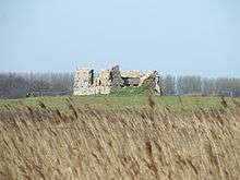 The remains of a chapel built on the original site of Leiston Abbey are located on the Minsmere Level to the south of the Minsmere New Cut.[3][6][19][20] These are the only visible remains at the site of the original Premonstratensian Abbey. The chapel was probably built when the abbey was relocated and stands on the site of the original monastic church, the stone from which was probably used to build the new abbey at Leiston.[19] It is thought to have been used as a chapel dedicated to St Mary until the dissolution of the monasteries in 1537.[19][21] The abbey was originally built on an island in the marshland but is believed to have suffered from frequent coastal flooding which led to its relocation to Leiston in 1363.[4][19] Geophysical surveys have shown that a number of archaeological features lie buried in the immediate area, including remains of the abbey church, cloisters and fish ponds.[3][19]