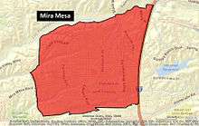 Mira Mesa is a community and neighborhood in the city of San Diego, California. The city-recognized Mira Mesa Community Plan Area is roughly bounded by Interstate 15 on the east, Interstate 805 on the west, the Los Peñasquitos Canyon on the north and Marine Corps Air Station Miramar on the south.[4] Most of the community plan area is referred to as Mira Mesa; the community plan area also includes the neighborhoods of Sorrento Valley and Sorrento Mesa.