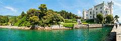 Miramare Castle (Italian: Castello di Miramare; German: Schloss Miramar; Slovene: Grad Miramar) is a 19th-century castle on the Gulf of Trieste near Trieste, northeastern Italy. It was built from 1856 to 1860 for Austrian Archduke Ferdinand Maximilian and his wife, Charlotte of Belgium, later Emperor Maximilian I and Empress Carlota of Mexico, based on a design by Carl Junker.