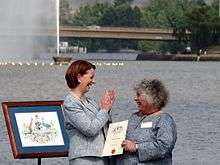 Margolyes shortly after being presented with her Australian citizenship certificate by then prime minister, Julia Gillard, during the 2013 National Flag Raising and Citizenship ceremony in Canberra
