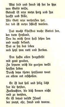 - 1 2 3 "Mit Fried' und Freud' ich fahr' dahin". hymnary.org. Retrieved 12 November 2014.