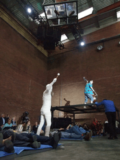 The staged premiere of Mittwoch was given by the Birmingham Opera Company on what would have been the composer's 84th birthday, Wednesday 22 August 2012 at the Argyle Works, a former factory in Digbeth, Birmingham, as part of the London 2012 Festival, with further performances on 23, 24, and 25 August (Anon. 2012; Brown 2012; Clements 2012). The director was Graham Vick, music director Kathinka Pasveer, designer Paul Brown, lighting Giuseppe di Iorio, and choreography Ron Howell. The production went on to win the 2012 Royal Philharmonic Society Award for Opera and Music Theatre.