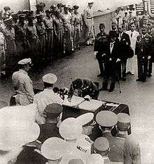 On March 31, 1854, Commodore Matthew Perry and the "Black Ships" of the United States Navy forced the opening of Japan to the outside world with the Convention of Kanagawa. Subsequent similar treaties with Western countries in the Bakumatsu period brought economic and political crises. The resignation of the shogun led to the Boshin War and the establishment of a centralized state nominally unified under the Emperor (the Meiji Restoration).[42]