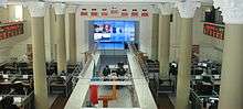 The Mongolian Stock Exchange is located in the former Children's Cinema building near Sükhbaatar Square, next to the headquarters of Mongolia Telecom Company and across from the Mongolian parliament's buildings. It was refurbished at a cost of US$4.5 million prior to the official start of trading; seats and screens were removed, a trading floor was created and equipped with computers, and automatic sinks were installed in the bathrooms.[13][15] The building itself is a pink-and-white neo-classical-style structure.[18] One corner of the building has been partitioned off to serve as an internet cafe.[28] Due to the color of its building, the Financial Times correspondent, Leslie Hook, defined it the pink house of equities.[27] Since then the building has been painted gray.