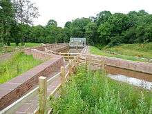 The scheme produces 670,000 Kw hours of electricity per year, which is enough to power 152 homes.[1] It also provides heat for the landowner, Ronald Kear's, home.[1] The scheme is built around two screw turbines. These Archimedes' screws are operating in reverse, with water flowing down, to power generators.[1] An earlier hydroelectric power station had been on the site from 1896 until 1953, which itself was built on the foundations of an even older forge.[1] Alongside the scheme is the Osbaston fish pass, built by the Environment Agency Wales at a cost of £600,000.[1] The fish pass allows river-spawning fish, such as salmon, to access an extra 125 miles of river - something which they had not been able to do since Osbaston Weir was put in place in the 18th century.[2]
