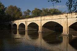 The Monocacy Aqueduct — or C&O Canal Aqueduct No. 2 — is the largest aqueduct on the Chesapeake and Ohio Canal, crossing the Monocacy River just before it empties into the Potomac River in Frederick County, Maryland, USA. The 438 foot (133.5 m) aqueduct was built by three separate contractors between 1829 and 1833 at the cost of US$127,900.