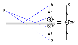 A monopole can be visualized (right) as being formed by replacing the bottom half of a vertical dipole antenna (c) with a conducting plane (ground plane) at right-angles to the remaining half. If the ground plane is large enough, the radio waves from the remaining upper half of the dipole (a) reflected from the ground plane will seem to come from an image antenna (b) forming the missing half of the dipole, which adds to the direct radiation to form a dipole radiation pattern. So the pattern of a monopole with a perfectly conducting, infinite ground plane is identical to the top half of a dipole pattern, with its maximum radiation in the horizontal direction, perpendicular to the antenna. Because it radiates only into the space above the ground plane, or half the space of a dipole antenna, a monopole antenna will have a gain of twice (3 dB greater than) the gain of a similar dipole antenna, and a radiation resistance half that of a dipole. Since a half-wave dipole has a gain of 2.19 dBi and a radiation resistance of 73 ohms, a quarter-wave monopole, the most common type, will have a gain of 2.19 + 3 = 5.19 dBi and a radiation resistance of about 36.8 ohms if it is mounted above a good ground plane.[1]