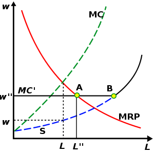 The left-hand side of this expression, , is the marginal revenue product of labor (roughly, the extra revenue produced by an extra worker) and is represented by the red MRP curve in the diagram. The right-hand side is the marginal cost of labor (roughly, the extra cost due to an extra worker) and is represented by the green MC curve in the diagram. Notably, the marginal cost is higher than the wage paid to the new worker by the amount