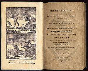 Mormonism Unvailed [sic] is a book published in 1834 by Eber D. Howe. The title page proclaims the book to be a contemporary exposé of Mormonism, and makes the claim that the historical portion of the Book of Mormon text was based upon a manuscript written by Solomon Spalding.