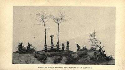 The Morning Star ceremony was a ritual human sacrifice of a young girl, performed only by the Skidi band of the Pawnee. It was connected to the Pawnee creation narrative, in which the mating of the male Morning Star with the female Evening Star created the first human being, a girl. The Skidi Pawnee practiced the Morning Star ritual regularly through the 1810s. The Missouri Gazette reported a sacrifice in 1818. US Indian agents sought to convince chiefs to suppress the ritual, and major leaders, such as Knife Chief, worked to change the practices objected to by the increasing number of American settlers on the Plains. The custom came to the wider attention of the public in the Eastern United States in 1820 due to reports of a young Pawnee warrior, Man Chief, who risked his life to rescue a Sioux girl from the sacrificial scaffold in defiance of the Pawnee priesthood.[11] The last known sacrifice was of Haxti, a 14-year-old Oglala Lakota girl on April 22, 1838.[12]