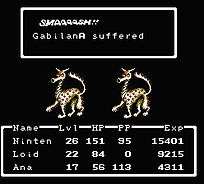 Like the Dragon Quest series, Mother uses a random encounter combat system. The player explores the overworld from a top-down perspective and occasionally enters a first-person perspective battle sequence where the player chooses attack options from a series of menus.[2] On their turn, the player selects between options to fight, guard, check enemy attributes, run away, use items, or use offensive, defensive, or healing psychic powers. The player can also set the battle on autopilot with the "auto" option.[3] Critical hits register with the series' signature "SMAAAASH" text and sound.[3]