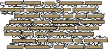 The crystallographic c-axis points approximately perpendicular to the shell wall, but the direction of the other axes varies between groups. Adjacent tablets have been shown to have dramatically different c-axis orientation, generally randomly oriented within ~20° of vertical.[4][5] In bivalves and cephalopods, the b-axis points in the direction of shell growth, whereas in the monoplacophora it is the a-axis that is this way inclined.[6] The interlocking of bricks of nacre has large impact on both the deformation mechanism as well as its toughness.[7] In addition, the mineral–organic interface results in enhanced resilience and strength of the organic interlayers.[8][9][10]