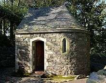 The monastery is sheltered immediately on the north side by a large outcrop, which was once known as Kite Hill.[5] According to an early publication with a foreword by Abbot Burder (1852), this site would also have been the preferred location for the original monastery designed by Railton, but soon after the purchase of the land, there had been some dispute as to whether the rock belonged to the monastic grounds or to the parish of Whitwick. Huge opposition to the founding of the monastery had been mounted by Francis Merewether, Vicar of Whitwick,[6][7] and parish authorities had apparently "spoke of holding parties of pleasure upon the rock and of over looking the monks". The county constable was eventually called in to resolve the dispute, and gave a decision in favour of the monks, whereafter opponents were obliged to refrain "from any further molestation of the religious in the erection of their new monastery".[8] A calvary was subsequently erected upon the summit of the rock, and this is now open to the public, and reached by a winding footpath, with an ascent aided by stone steps fashioned by the monks.