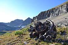 The rock which forms the visible surface of Mount Timpanogos is primarily limestone composed of compacted sediment laid down onto an ancient seafloor over millions of years during the late Carboniferous Period (roughly 300 million years ago).[6][7] Older rock exists beneath the limestone on the surface. The limestone was subsequently lifted high above sea level and the mountain itself became prominent as the Western valley sunk due to basin and range faulting.[8] The most contemporary features of the mountain were formed through recent glacial and water erosion.