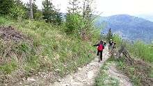 Mountain unicycling is an adventure sport that consists of traversing rough terrain on a unicycle. Mountain unicycling ('muni') is undertaken on similar terrain to mountain biking. However, muni requires much more attention to the microfeatures of the short distance in front of the wheel.[1] Unicycles' lack of a freewheel means that descents must be controlled all the way, and the typical lack a gear system (though two-gear hubs are available), prevents the rider from reaching high speeds. Muni usually takes place on specially designed unicycles, which are equipped with strong hubs, large, knobbly tires, high-grip pedals and rugged frames. Some are also equipped with rim or disc brakes, having the lever mounted under the nose of the saddle. The brake primarily helps to compensate the downhill-slope force, while more expert riders also use it to decelerate or stop.[1]