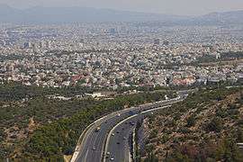 Athens sprawls across the central plain of Attica that is often referred to as the Athens or Attica Basin (Greek: Λεκανοπέδιο Αττικής). The basin is bounded by four large mountains: Mount Aigaleo to the west, Mount Parnitha to the north, Mount Pentelicus to the northeast and Mount Hymettus to the east.[31] Beyond Mount Aegaleo lies the Thriasian plain, which forms an extension of the central plain to the west. The Saronic Gulf lies to the southwest. Mount Parnitha is the tallest of the four mountains (1,413 m (4,636 ft)),[32] and has been declared a national park.