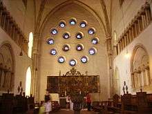 Following a plan by Fritz Thoma, twelve round windows were built in a circle in the west wall, with four further windows arranged in a square inside them. This arrangement was based on the original romanesque westwerk, with clear influence of 1950s architectural fashions. Scornful names for the sixteen windows circulated among the populace. Thus they are sometimes called "Keller windows" (in reference to their builder, bishop Keller), "Seelenbrause" (Soul-burst),[12] or "Wählscheibe Gottes" (God's rotary dial).[12]